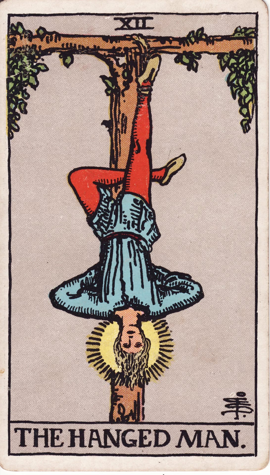 The Hanged Man is the twelfth card in a suit of twenty-two, the Fool’s metaphor for this moment in his life he jumps so naturally into. The Fool comes to this by way of the eleventh card, Justice. Justice instructs: asses what you have received, and do justice in your assessment. The truth is found by way of weighing what you receive against what you want. So you weigh. What you find is either hand heavier than the other—so the truth is what you received, or the truth is that you received, and that you wanted more—or both hands at equilibrium—so the truth is that you received as much as you wanted, or the truth is that you wanted as much as you received.